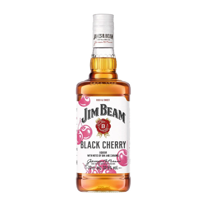 Jim Beam Cherry is a bourbon liqueur infused with natural black cherry flavors, offering a blend of traditional bourbon notes like oak and vanilla with a sweet, dark cherry profile. It is smooth and mellow, suitable for sipping neat, on the rocks, or mixed with cola or iced tea.