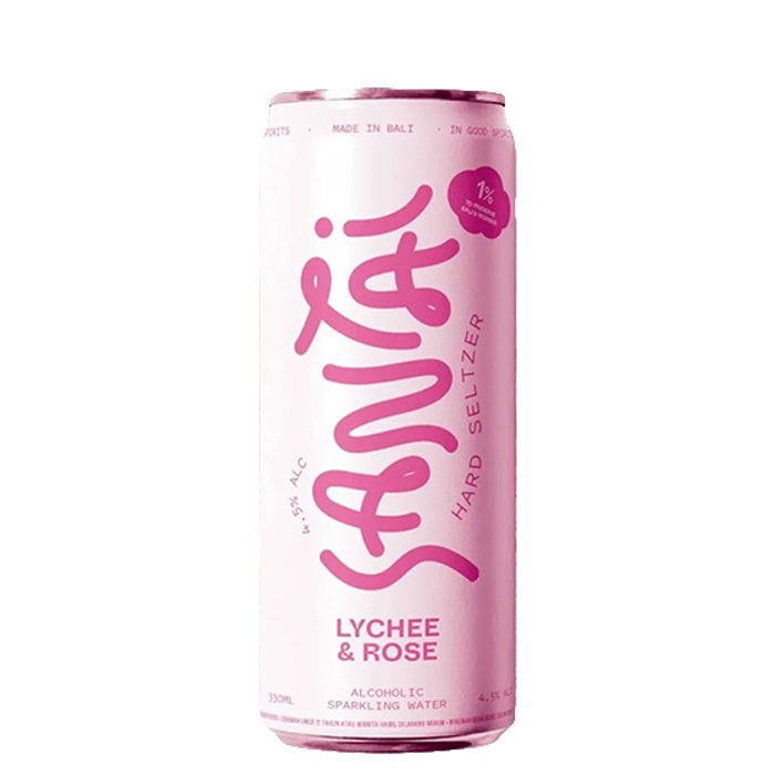 Santai Lychee Seltzer is a refreshing tropical hard seltzer made in Bali with natural flavors. It's a light and low-calorie beverage, perfect for those seeking a guilt-free and flavorful refreshment. The seltzer is crafted with real fruit juice and purified carbonated water, offering a crisp, bubbly experience with a natural lychee flavor.
